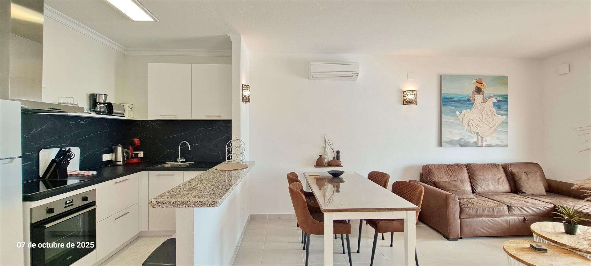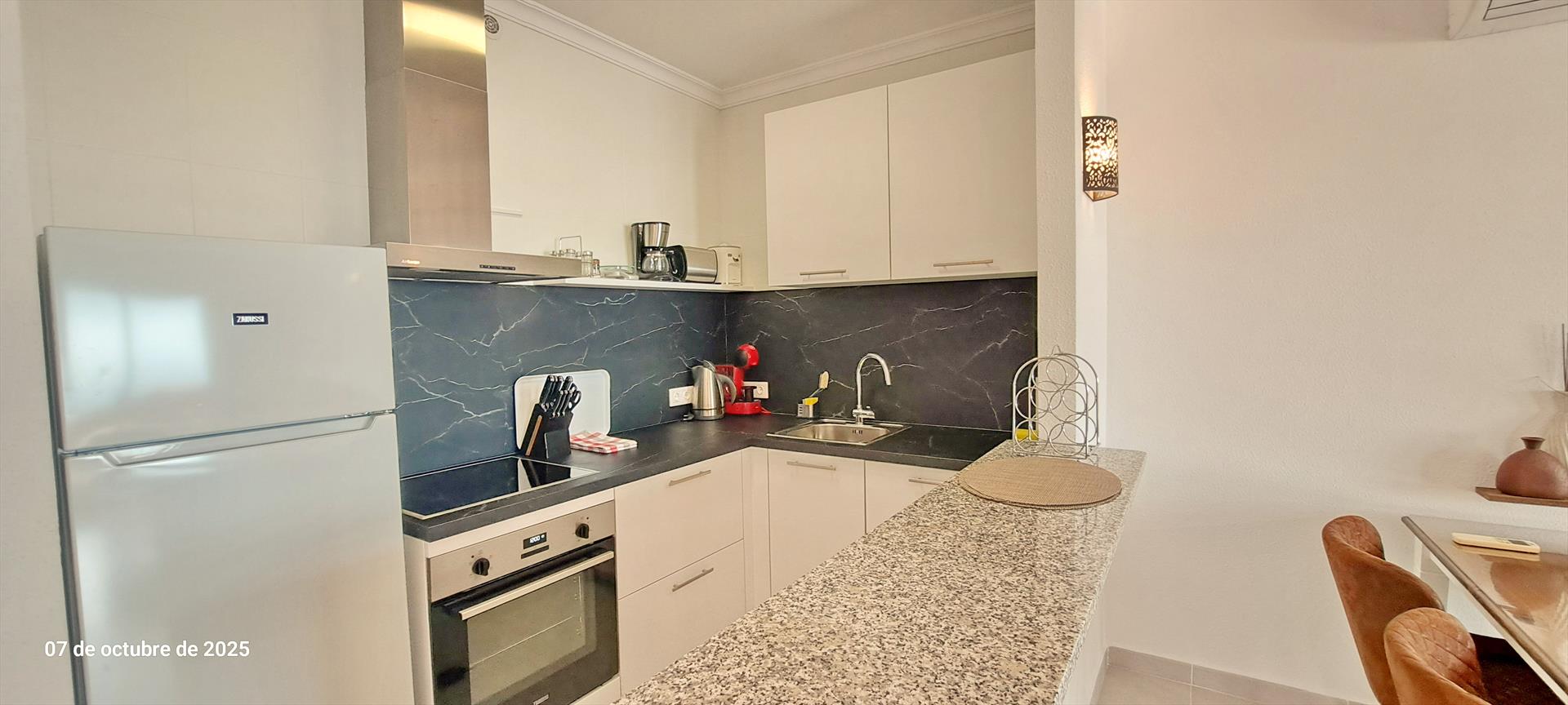 - cocina abierta con cocina de inducción, horno eléctrico, microondas, lavavajillas, frigorífico con congelador, cafetera y tostadora
