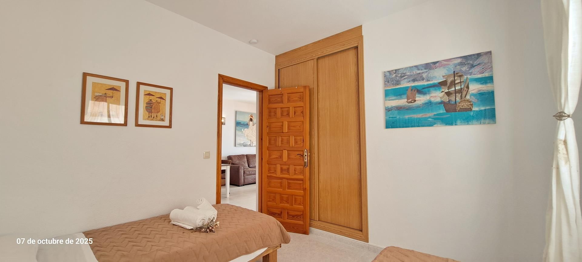 El apartamento dispone de 2 dormitorios (uno con cama doble y otro con dos camas individuales) y 1 baño completo, además de un salón luminoso, cocina totalmente equipada y una terraza perfecta para relajarse disfrutando de las vistas al mar.