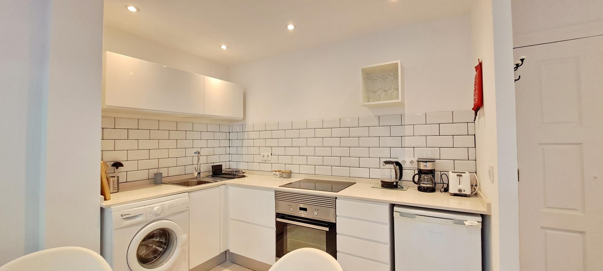 • cocina abierta con vitrocerámica, horno eléctrico, microondas, refrigerador, cafetera y tostadora