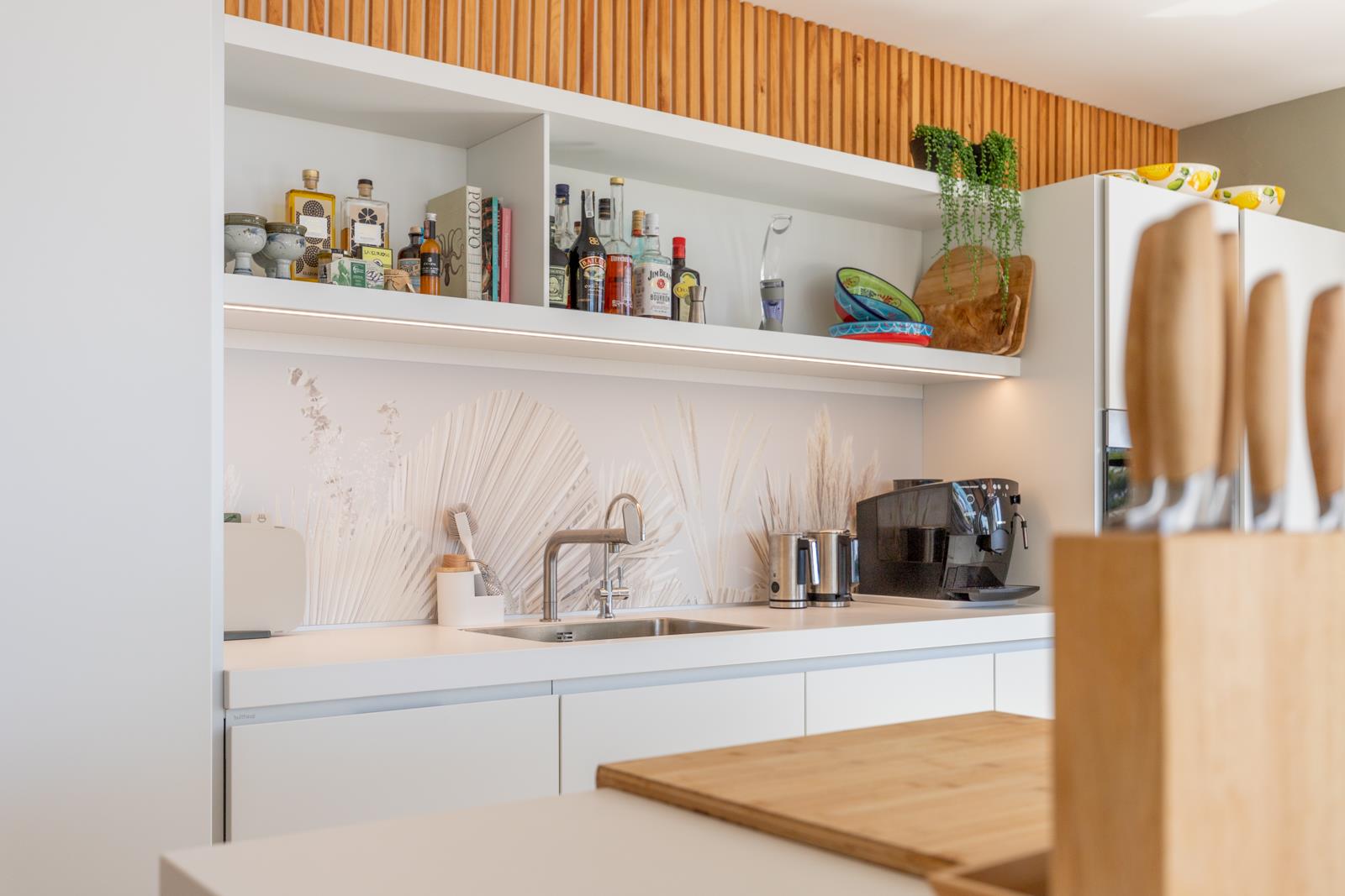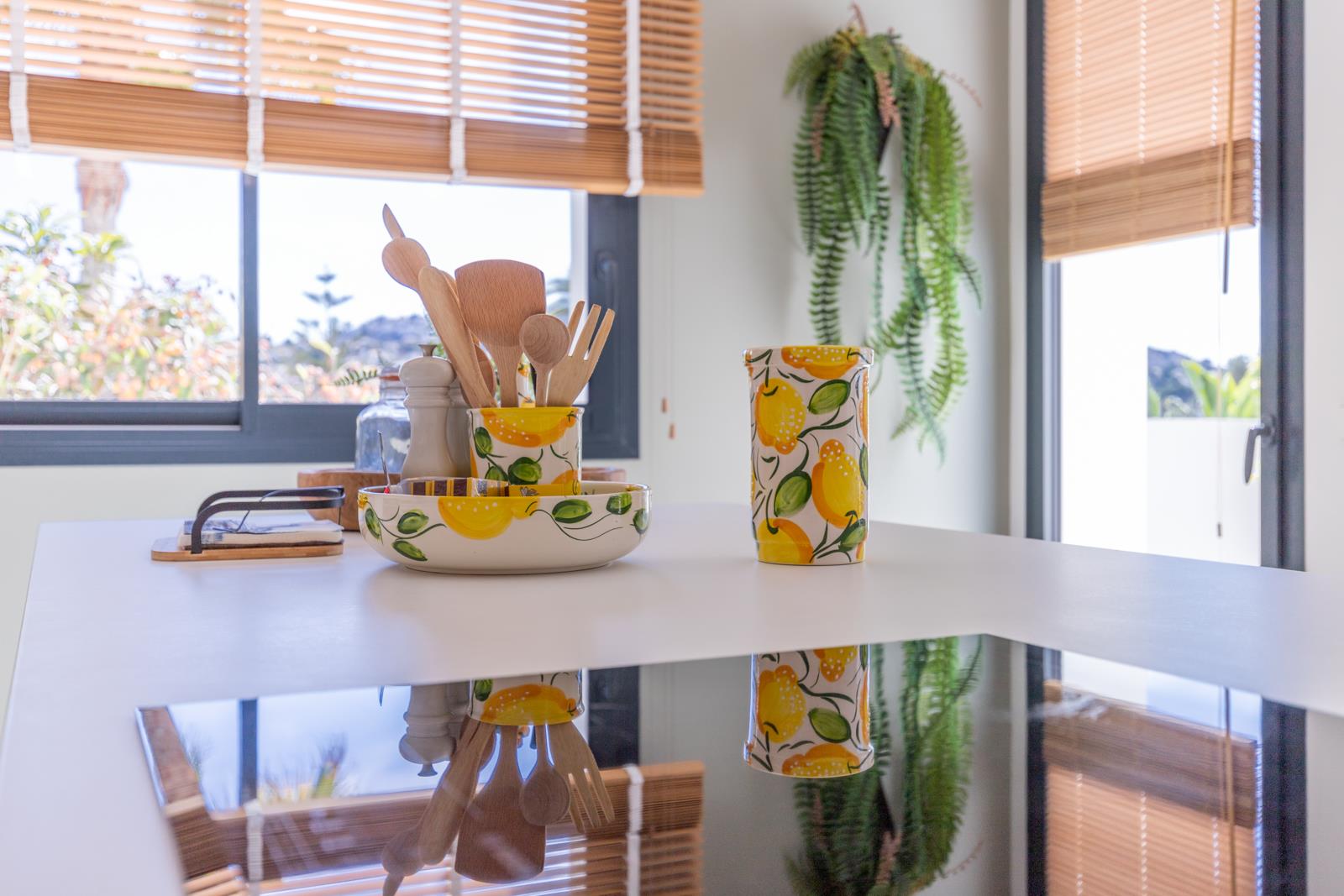 - cocina abierta con placa de inducción, horno eléctrico, microondas, lavavajillas, frigorífico-congelador, cafetera, batidora y tostadora