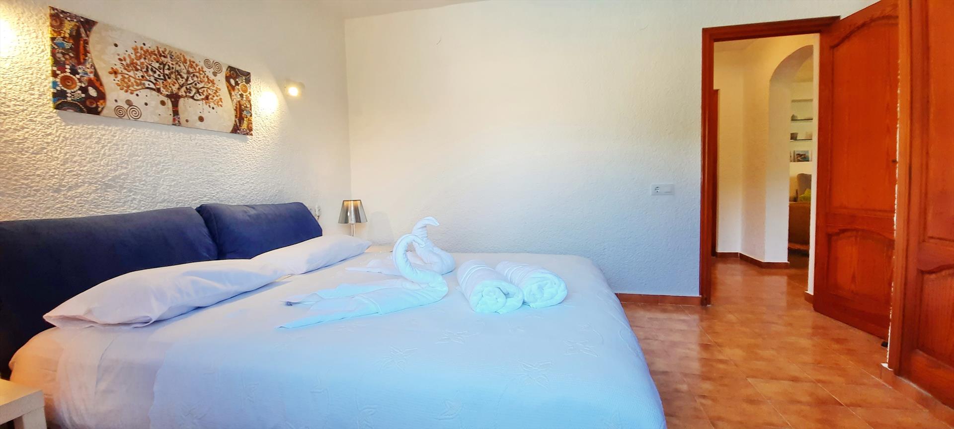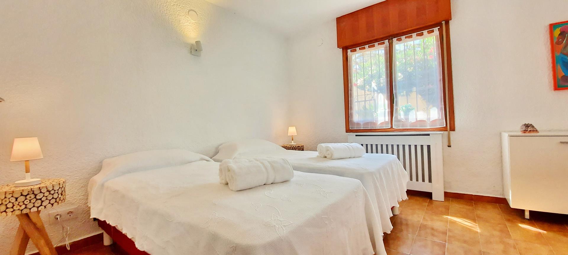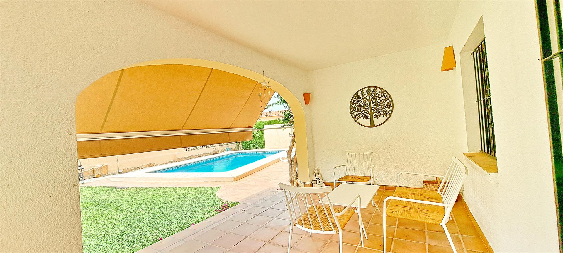 La casa tiene 2 dormitorios y 1 cuarto de baño. El alojamiento ofrece un jardín con césped y árboles y una piscina grande.  El confort y la cercanía de la playa, sitios para salir, actividades deportivas y lugares para ir de compras hacen de esta villa un alojamiento ideal para pasar sus vacaciones en España con familia o amigos.