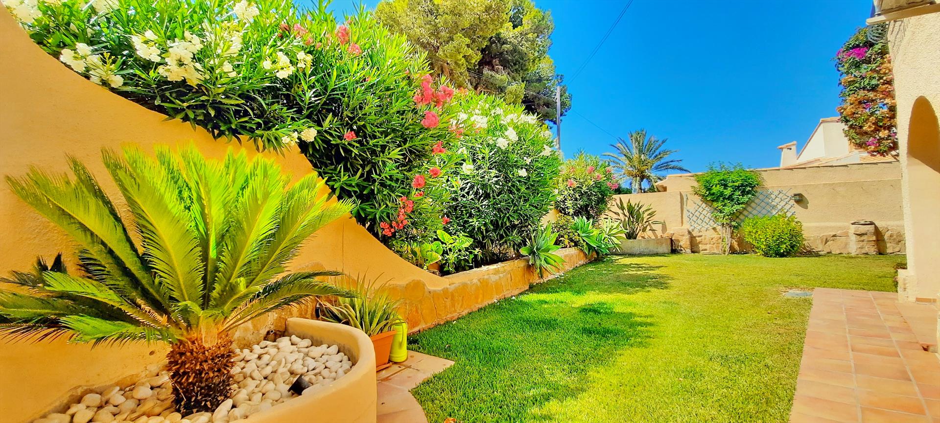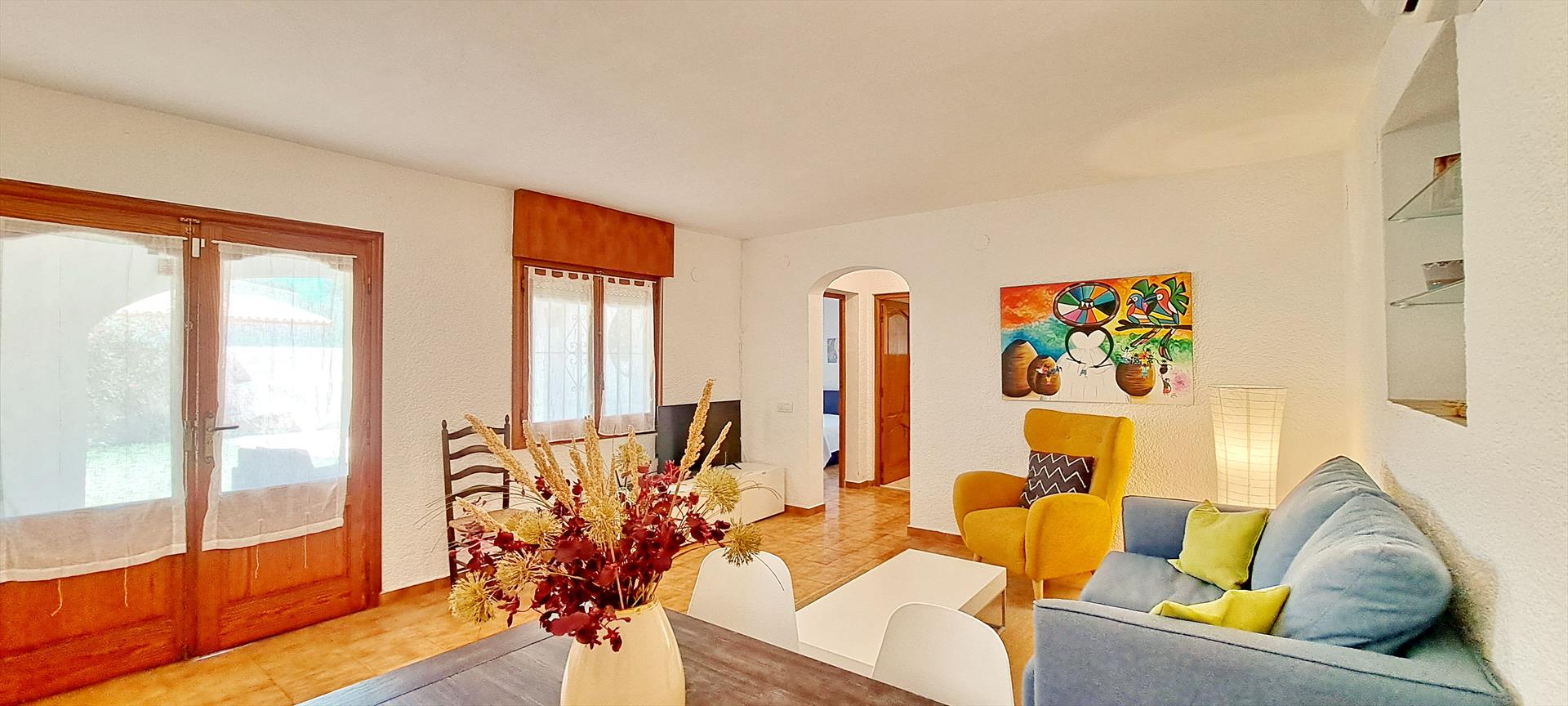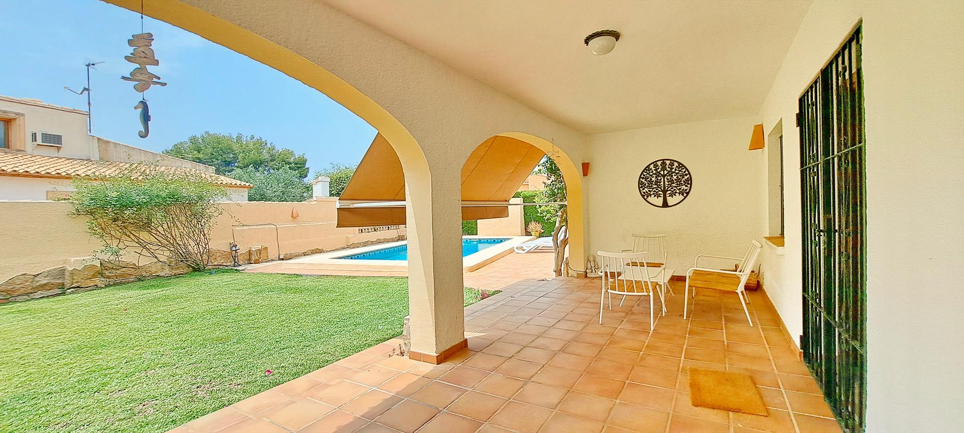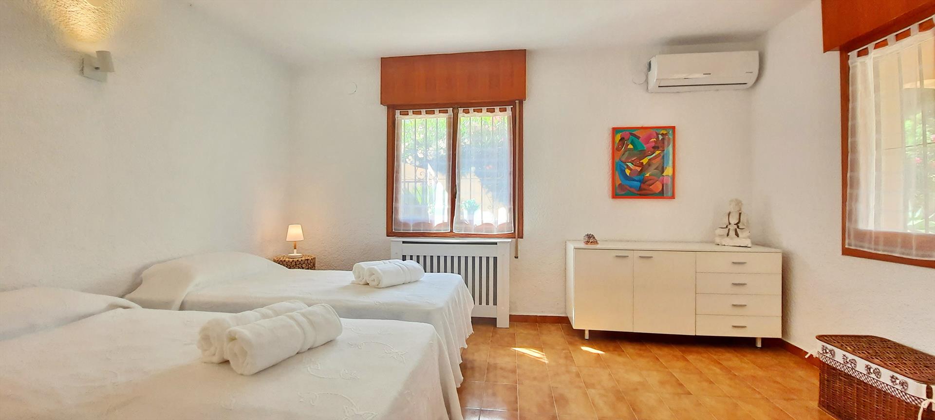 La casa tiene 2 dormitorios y 1 cuarto de baño. El alojamiento ofrece un jardín con césped y árboles y una piscina grande.  El confort y la cercanía de la playa, sitios para salir, actividades deportivas y lugares para ir de compras hacen de esta villa un alojamiento ideal para pasar sus vacaciones en España con familia o amigos.