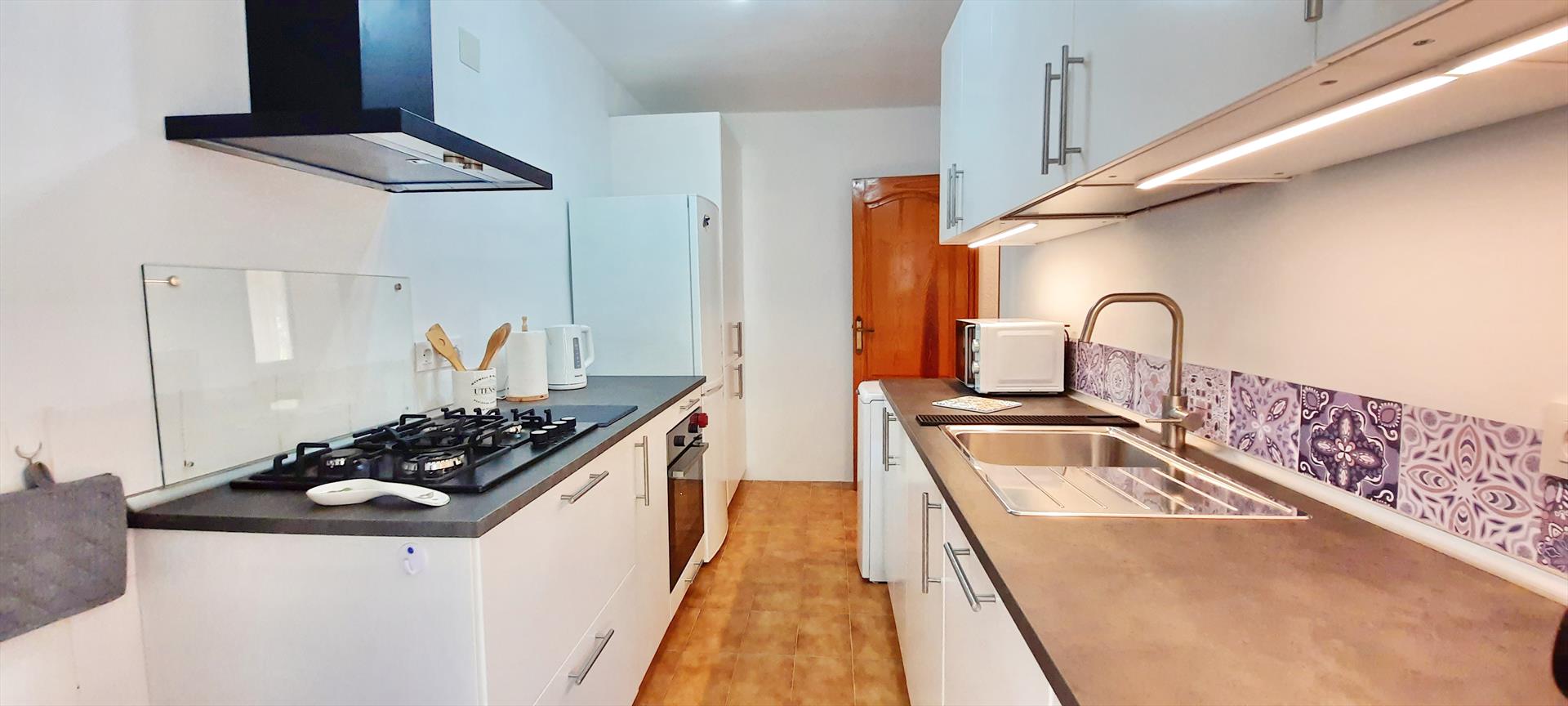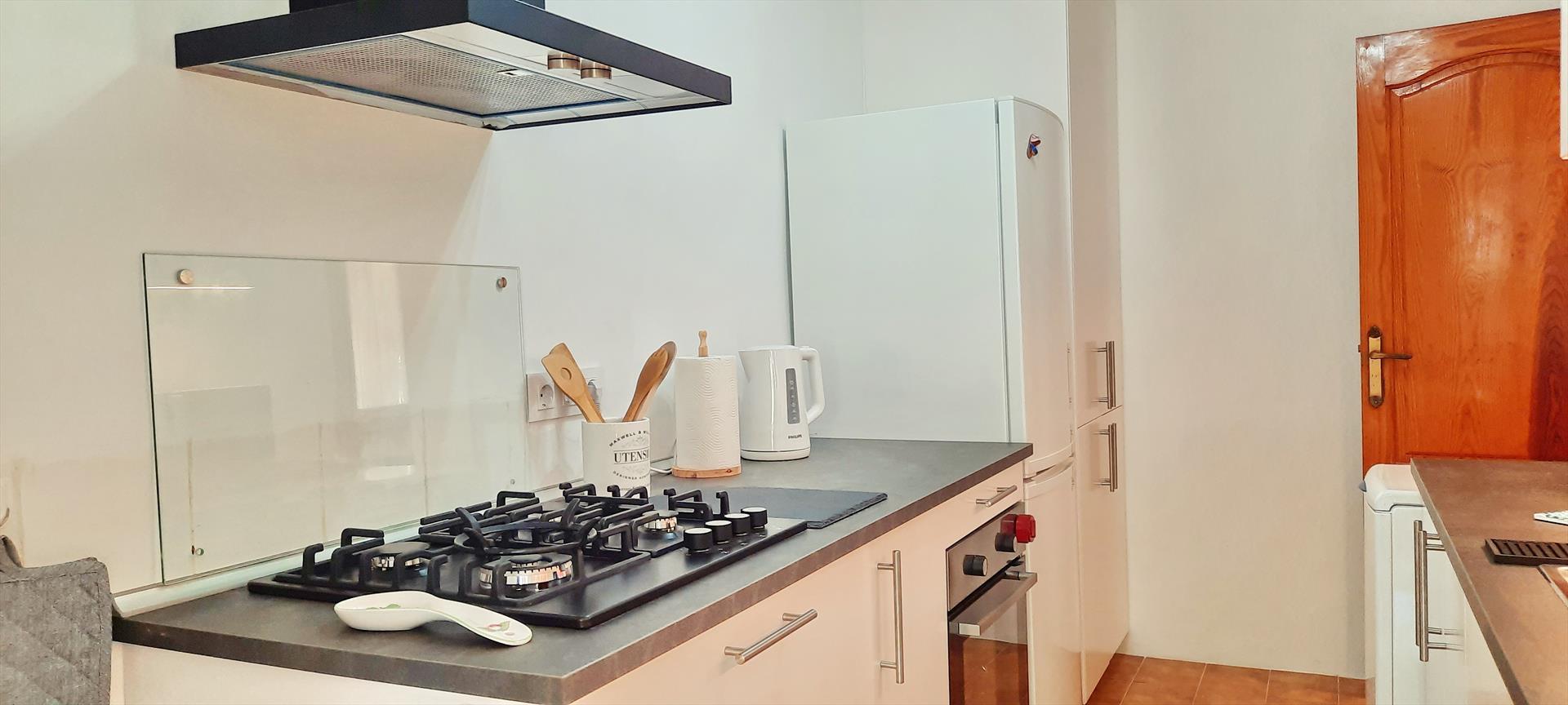 • cocina con cocina de gas, horno eléctrico, microondas, lavavajillas, refrigerador-congelador, cafetera, calentador de agua, batidor, tostador y exprimidor