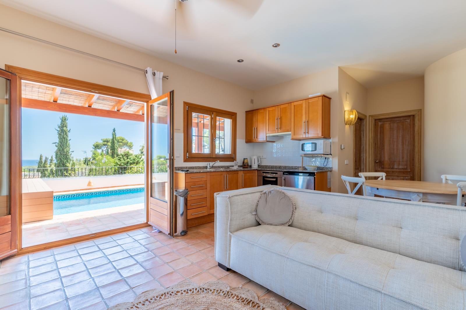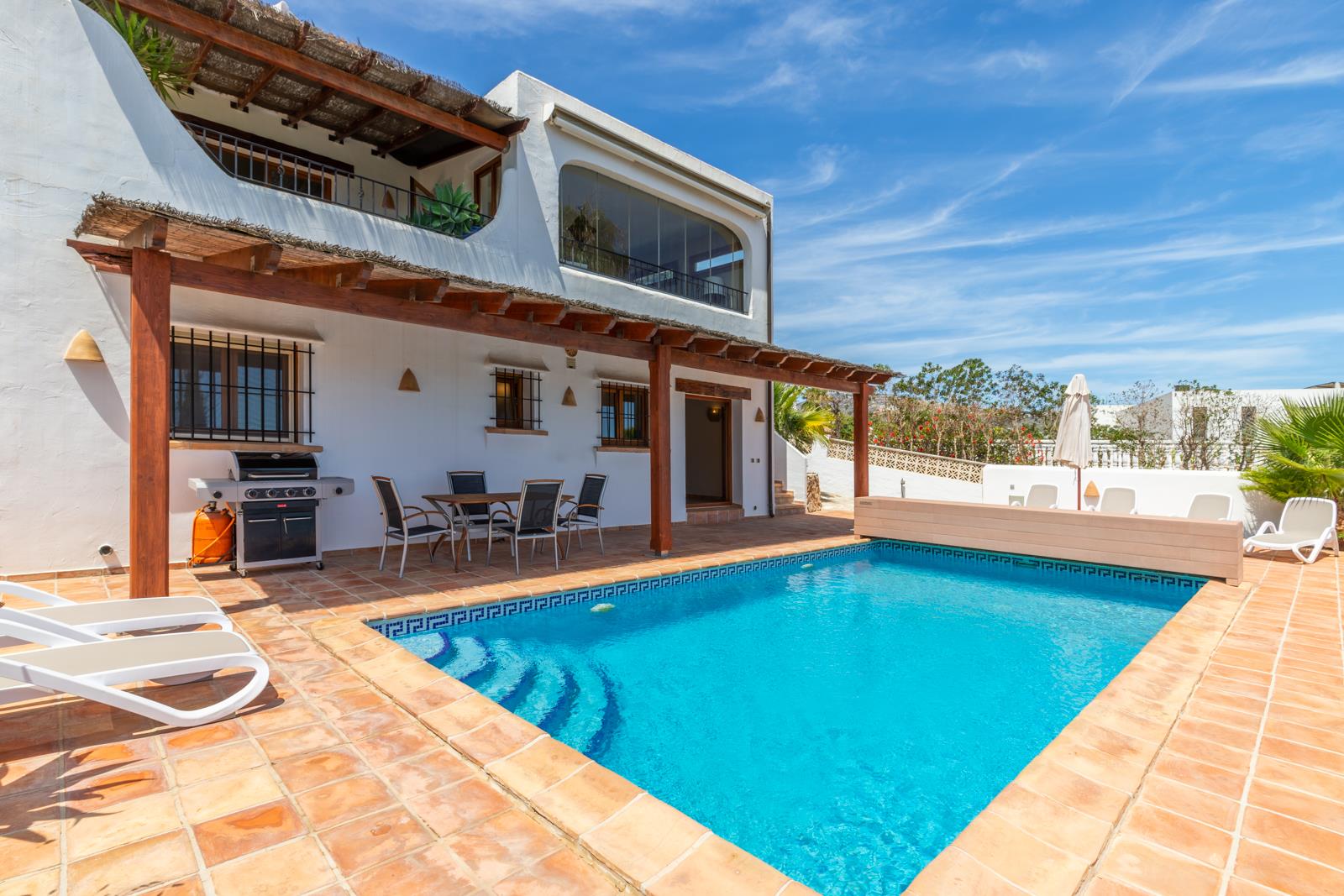 La villa tiene 4 dormitorios y 4 cuartos de baño, distribuidos en la vivienda principal y un apartamento. El alojamiento ofrece mucha privacidad, un jardín maravilloso con césped y árboles, una piscina climatizada maravillosa y unas maravillosas vistas al mar. El confort y la cercanía de la playa, sitios para salir, actividades deportivas y lugares para ir de compras hacen de esta villa de lujo un alojamiento perfecto para pasar sus vacaciones en España con familia o amigos.