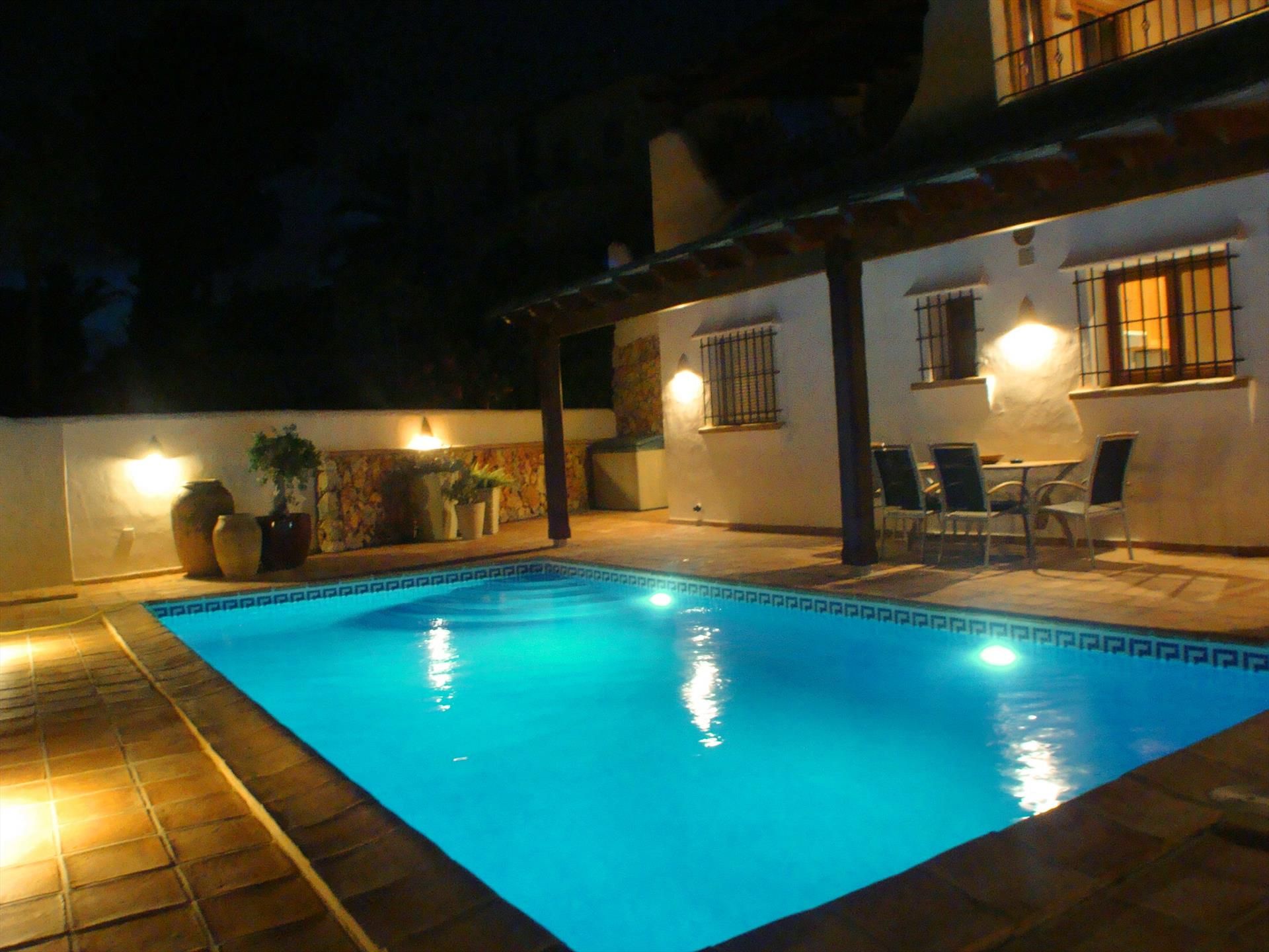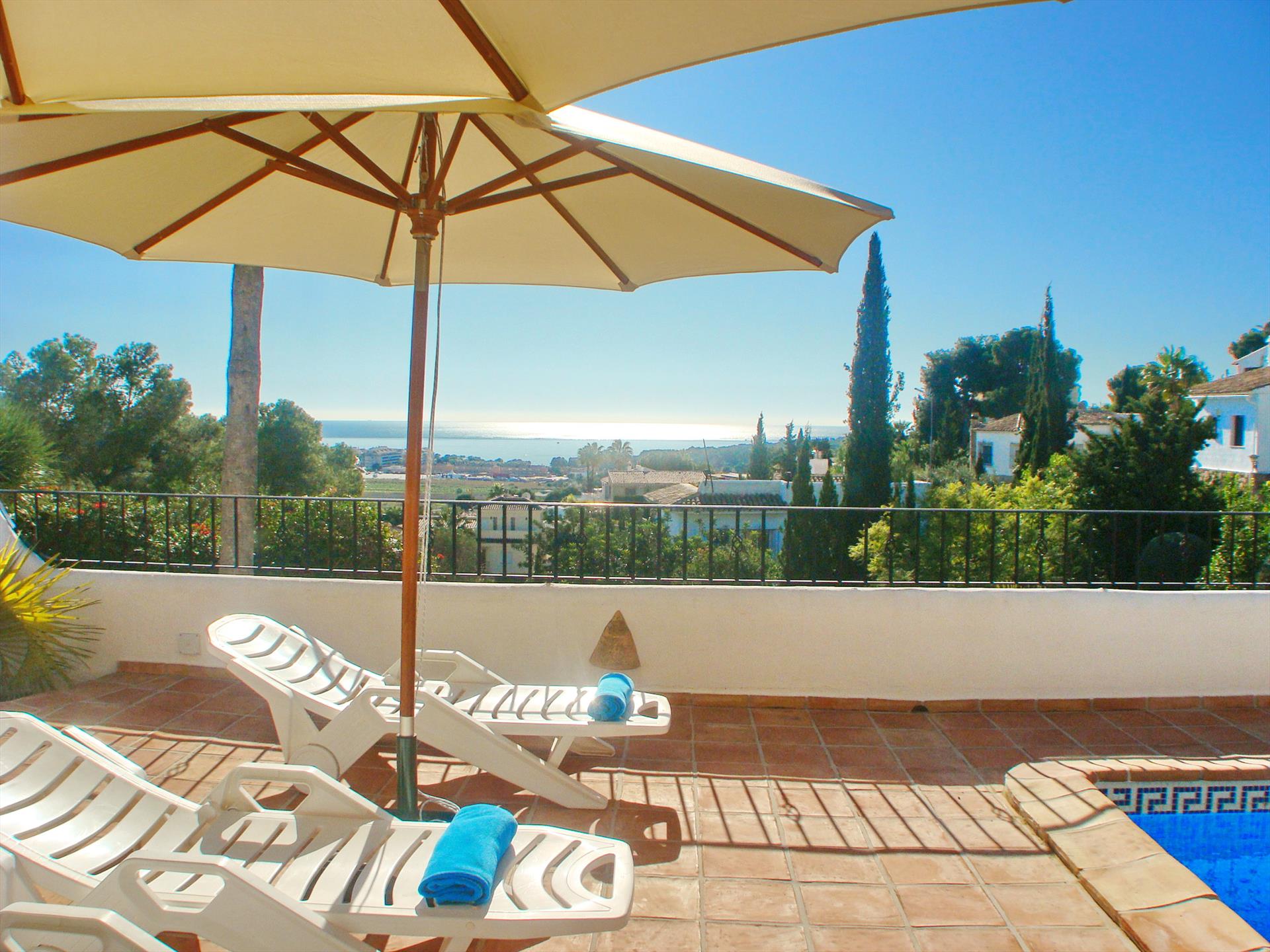 La villa tiene 4 dormitorios y 4 cuartos de baño, distribuidos en la vivienda principal y un apartamento. El alojamiento ofrece mucha privacidad, un jardín maravilloso con césped y árboles, una piscina climatizada maravillosa y unas maravillosas vistas al mar. El confort y la cercanía de la playa, sitios para salir, actividades deportivas y lugares para ir de compras hacen de esta villa de lujo un alojamiento perfecto para pasar sus vacaciones en España con familia o amigos.