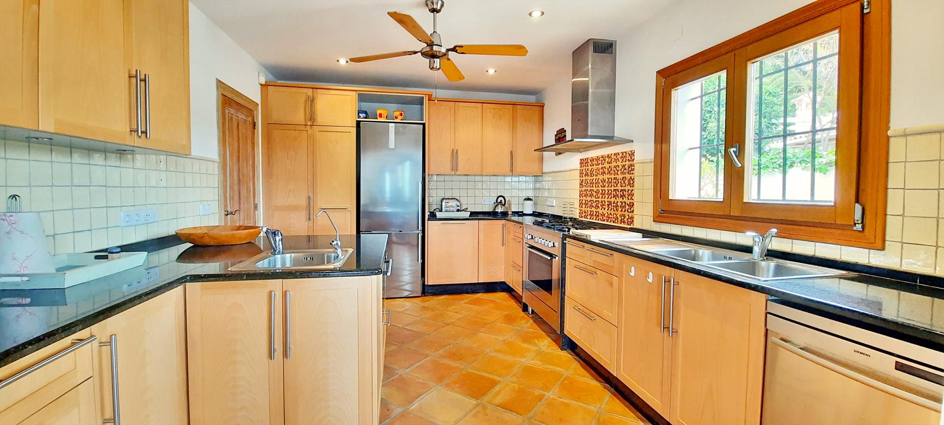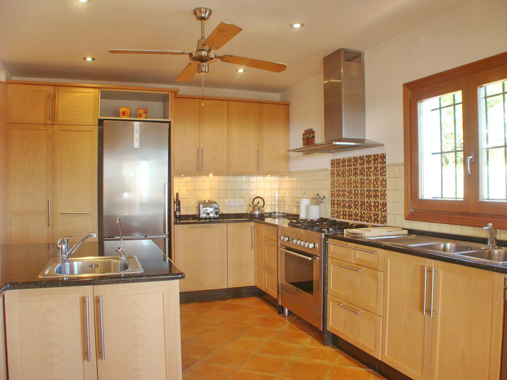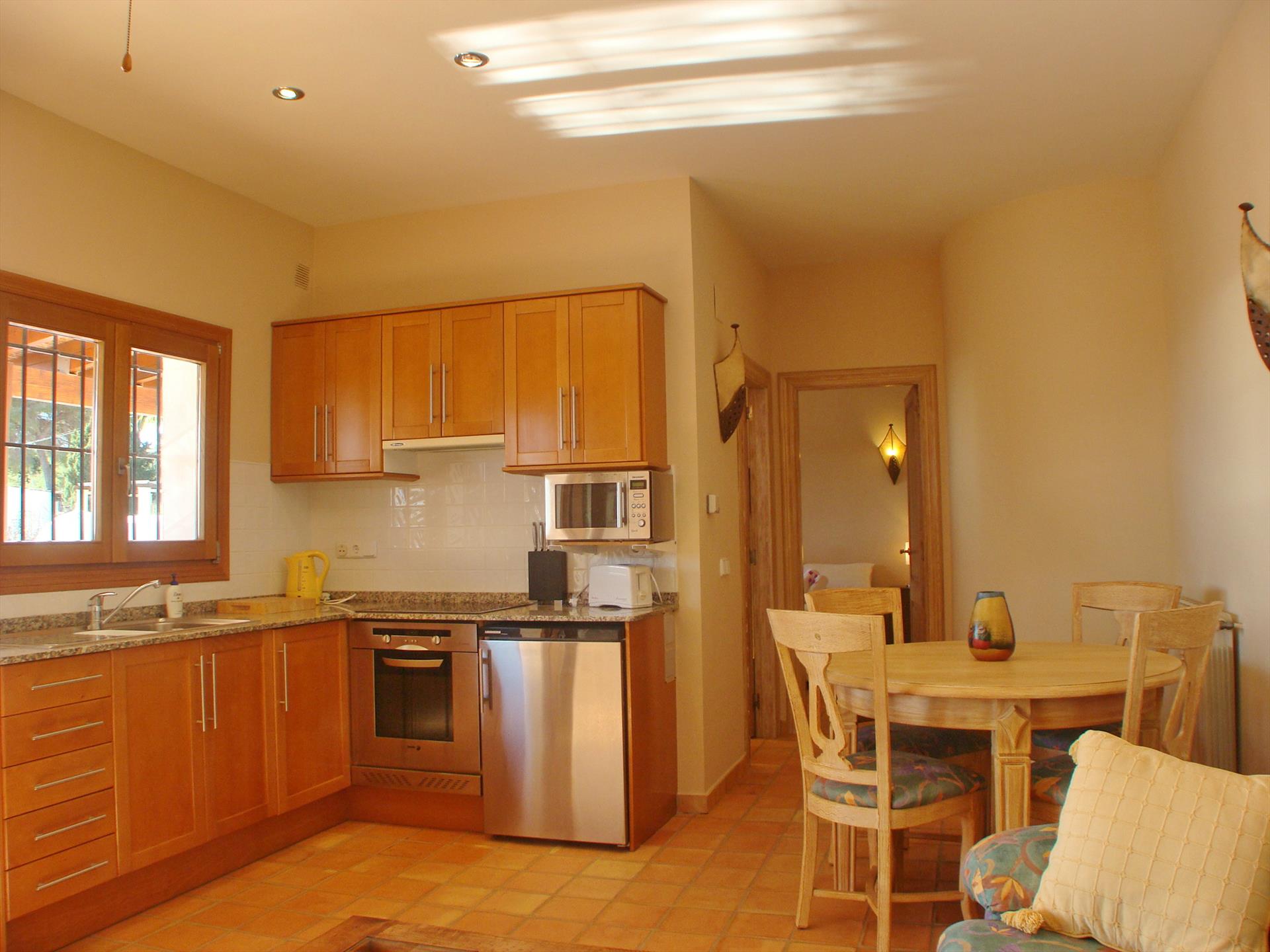 - cocina con cocina de gas, horno eléctrico, microondas, lavavajillas, refrigerador-congelador, cafetera, calentador de agua, batidor, tostador y exprimidor