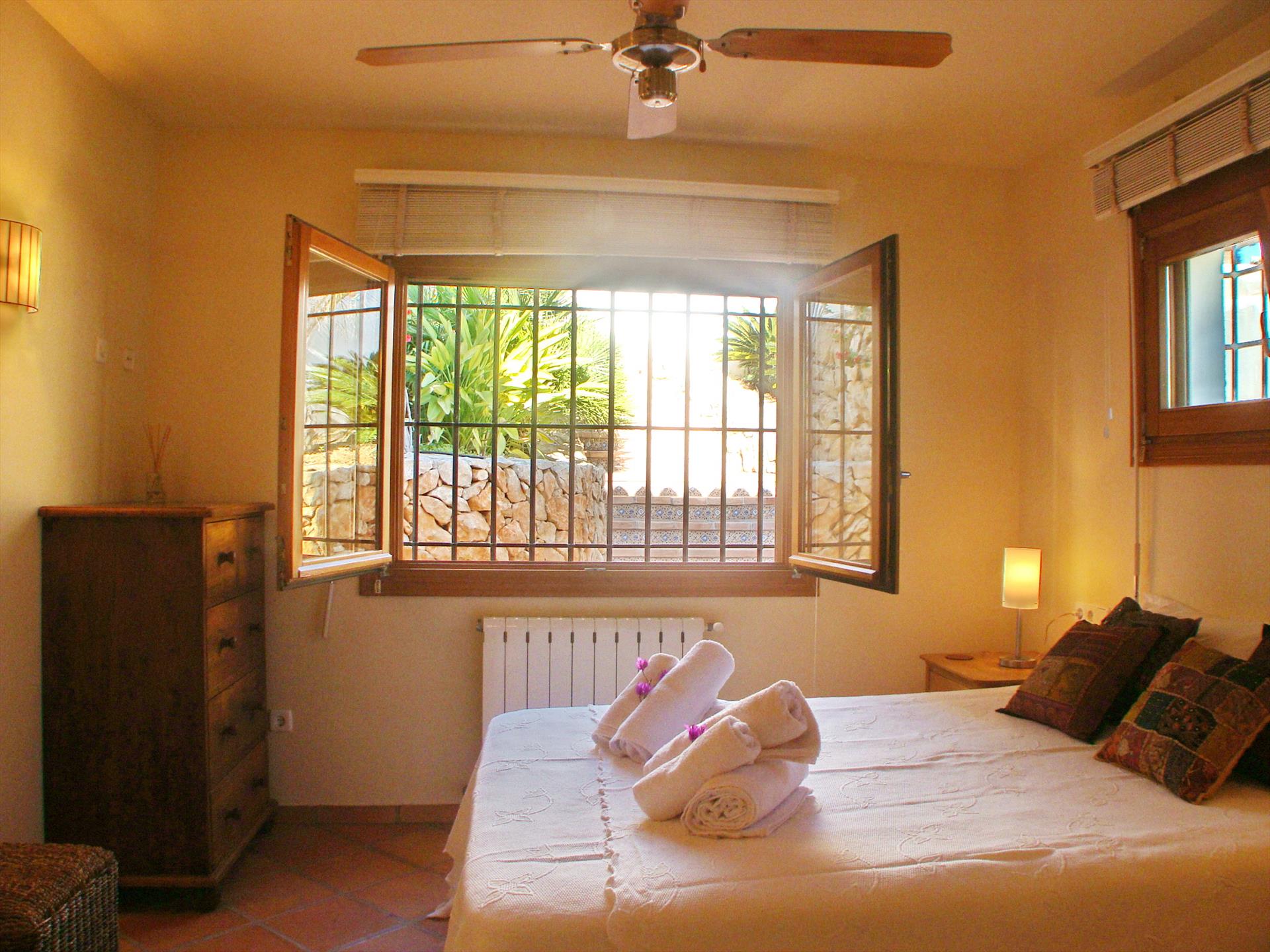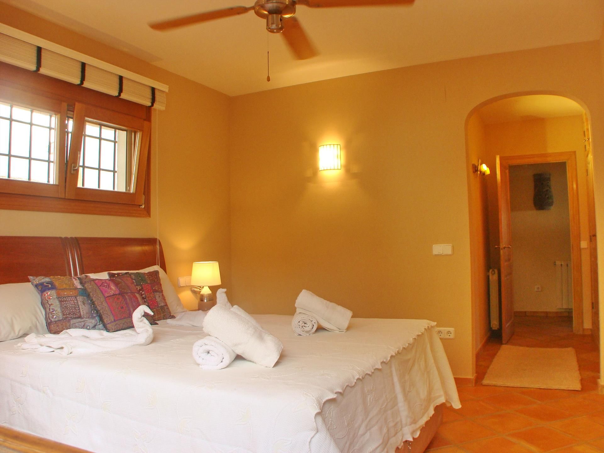 - dormitorio con cama doble, ventilador, aire acondicionado y baño en suite
