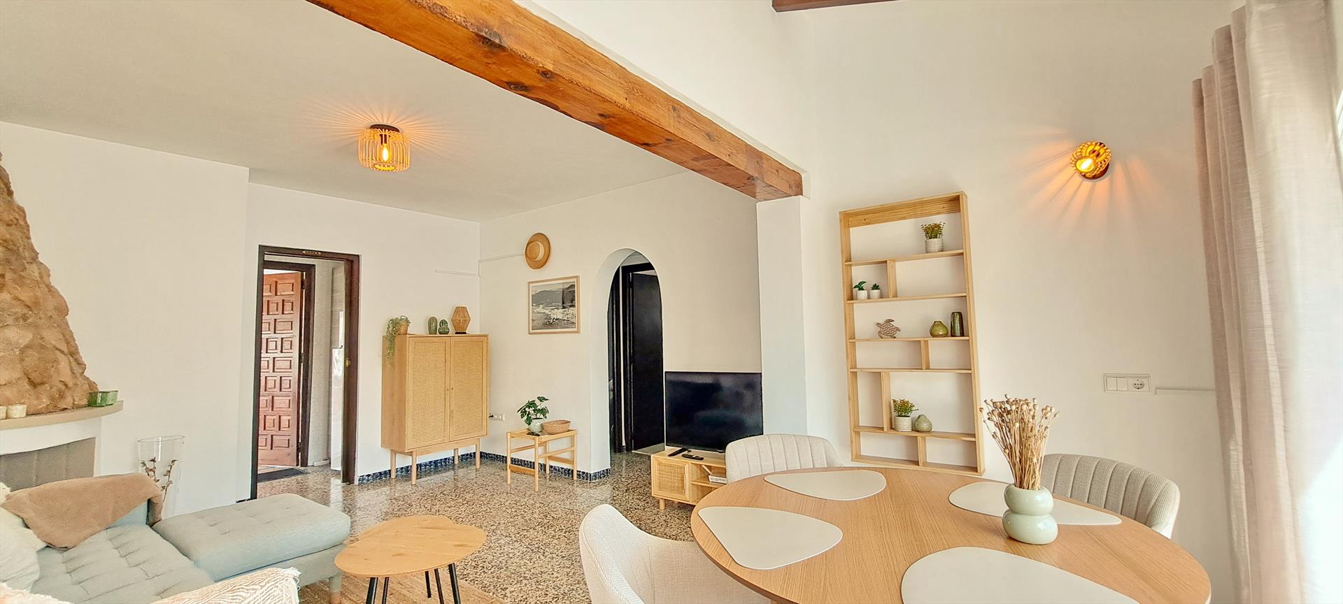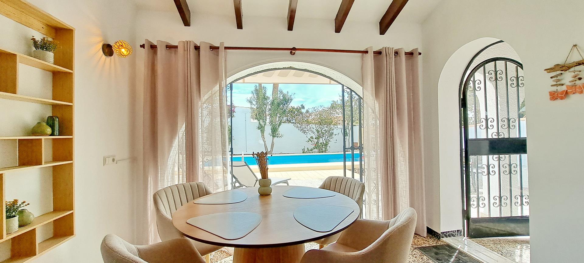 La villa cuenta con 3 dormitorios y 2 baños, distribuidos entre el alojamiento principal y una unidad separada. El alojamiento ofrece mucha privacidad, un jardín con árboles y una maravillosa piscina climatizada. Su comodidad y la cercanía a la playa, lugares de compras, actividades deportivas y centros de entretenimiento hacen de esta villa un lugar ideal para pasar sus vacaciones en España con familia o amigos.