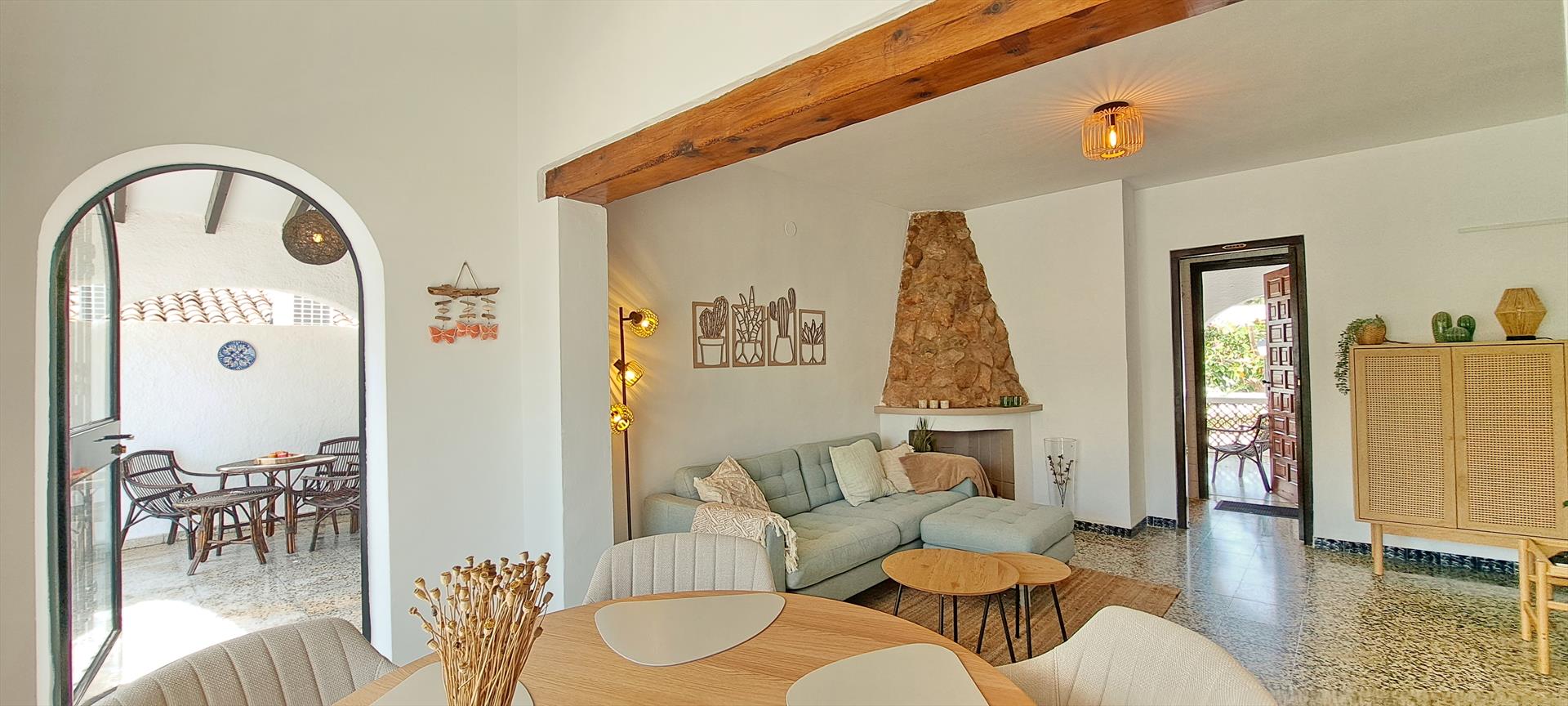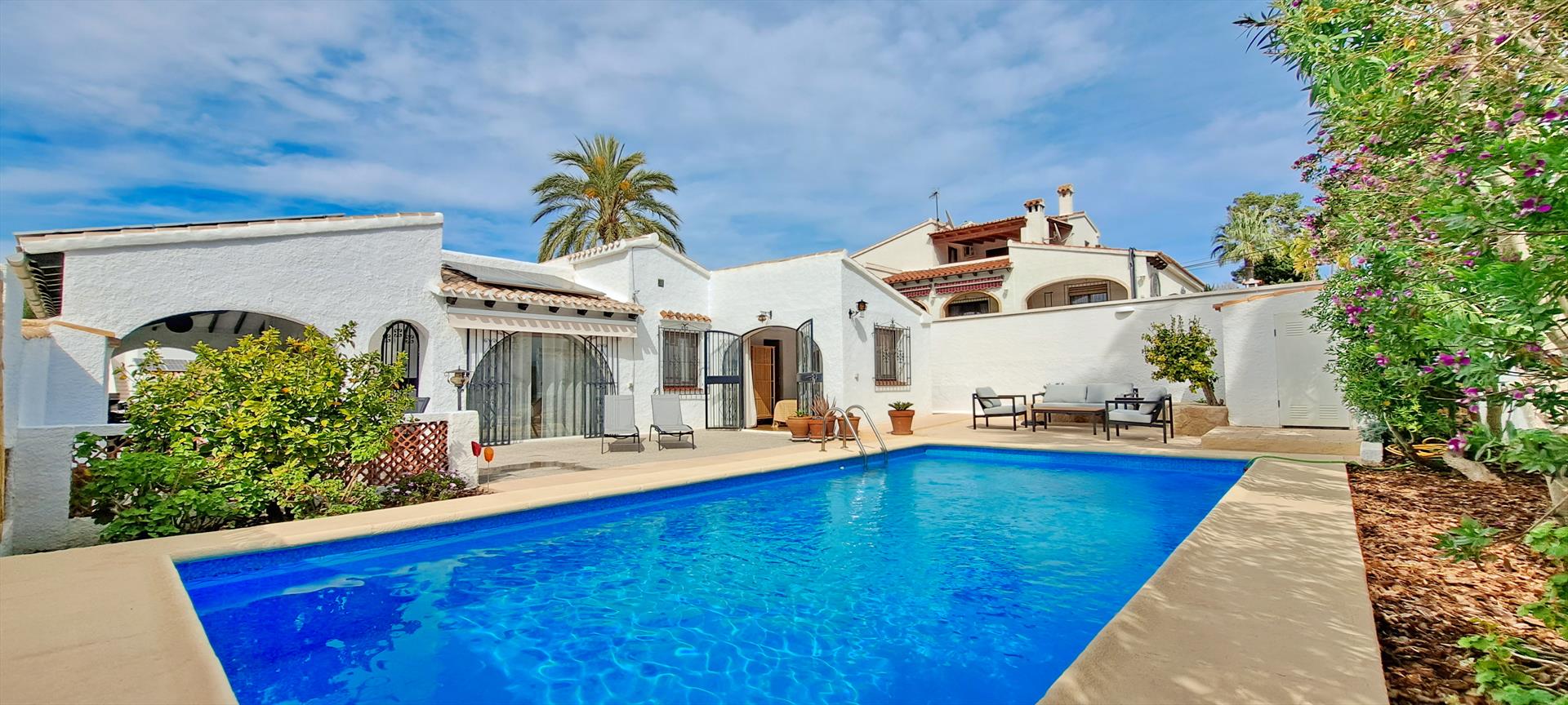 Villa clásica y alegre en Moraira, Costa Blanca, España, con piscina climatizada para 5 personas. La casa está situada cerca de restaurantes y bares, tiendas y supermercados, y se encuentra a 1 km de la playa de Moraira.