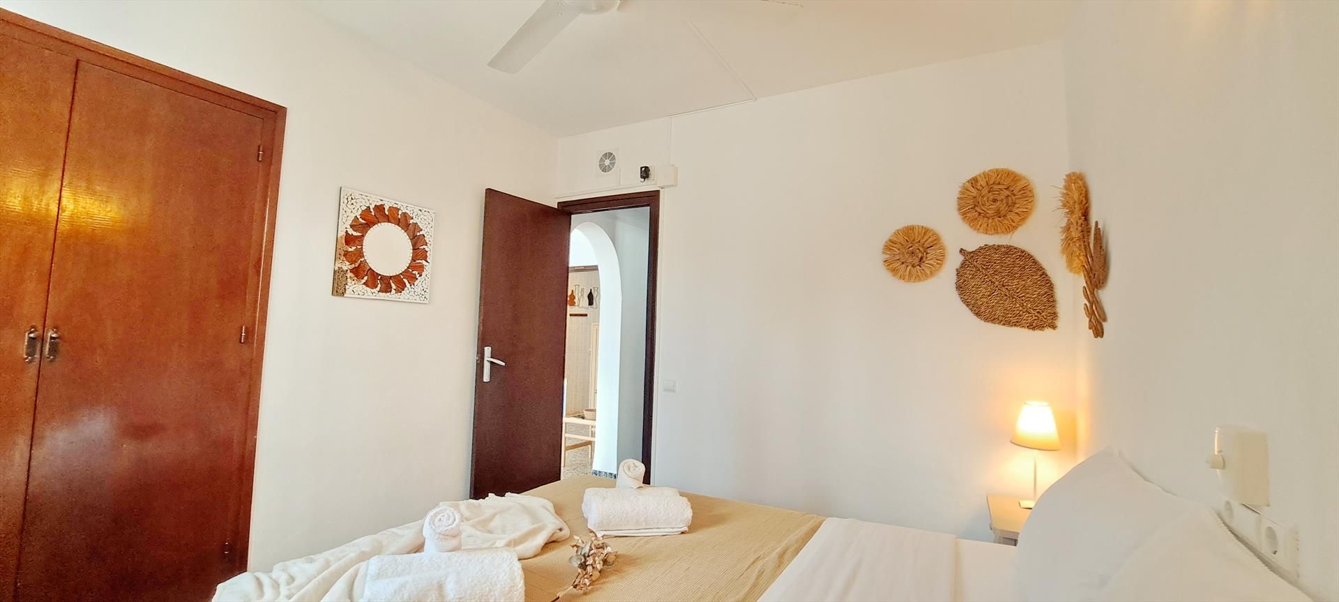 • dormitorio con cama doble y ventilador