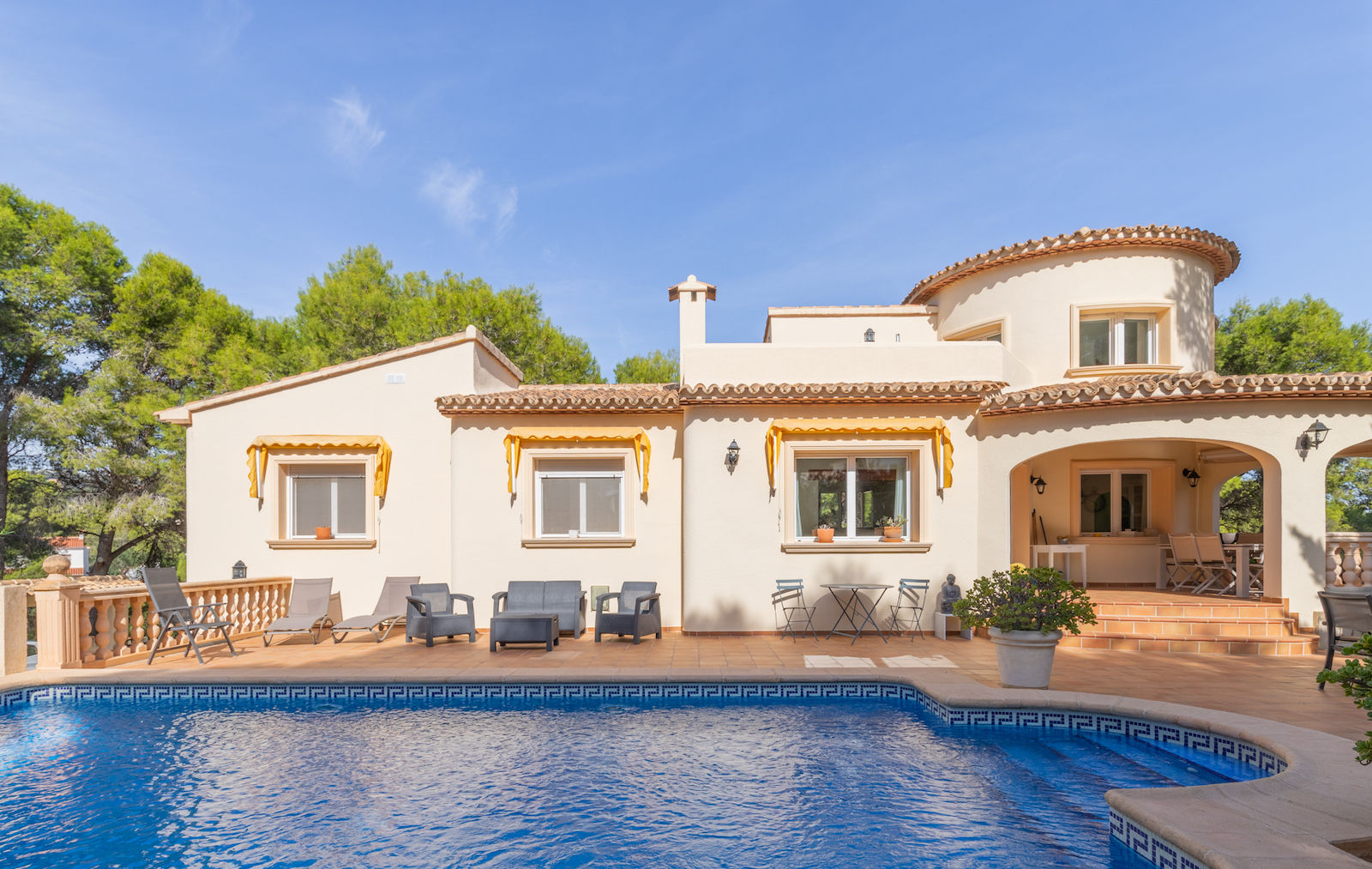 The villa has 3 bedrooms and 3 bathrooms, spread over 2 levels. The accommodation offers a lot of privacy, a garden with trees and a wonderful large swimming pool. Its comfort and the vicinity of the beach, sports activities and places to go out make this an ideal villa to spend your holidays in Spain with family or friends.