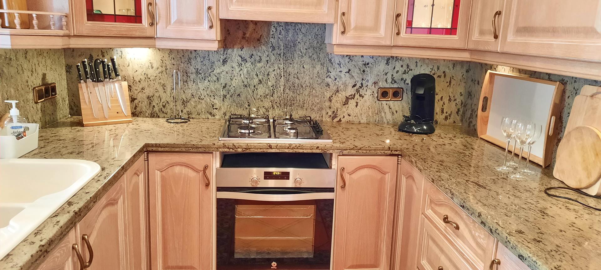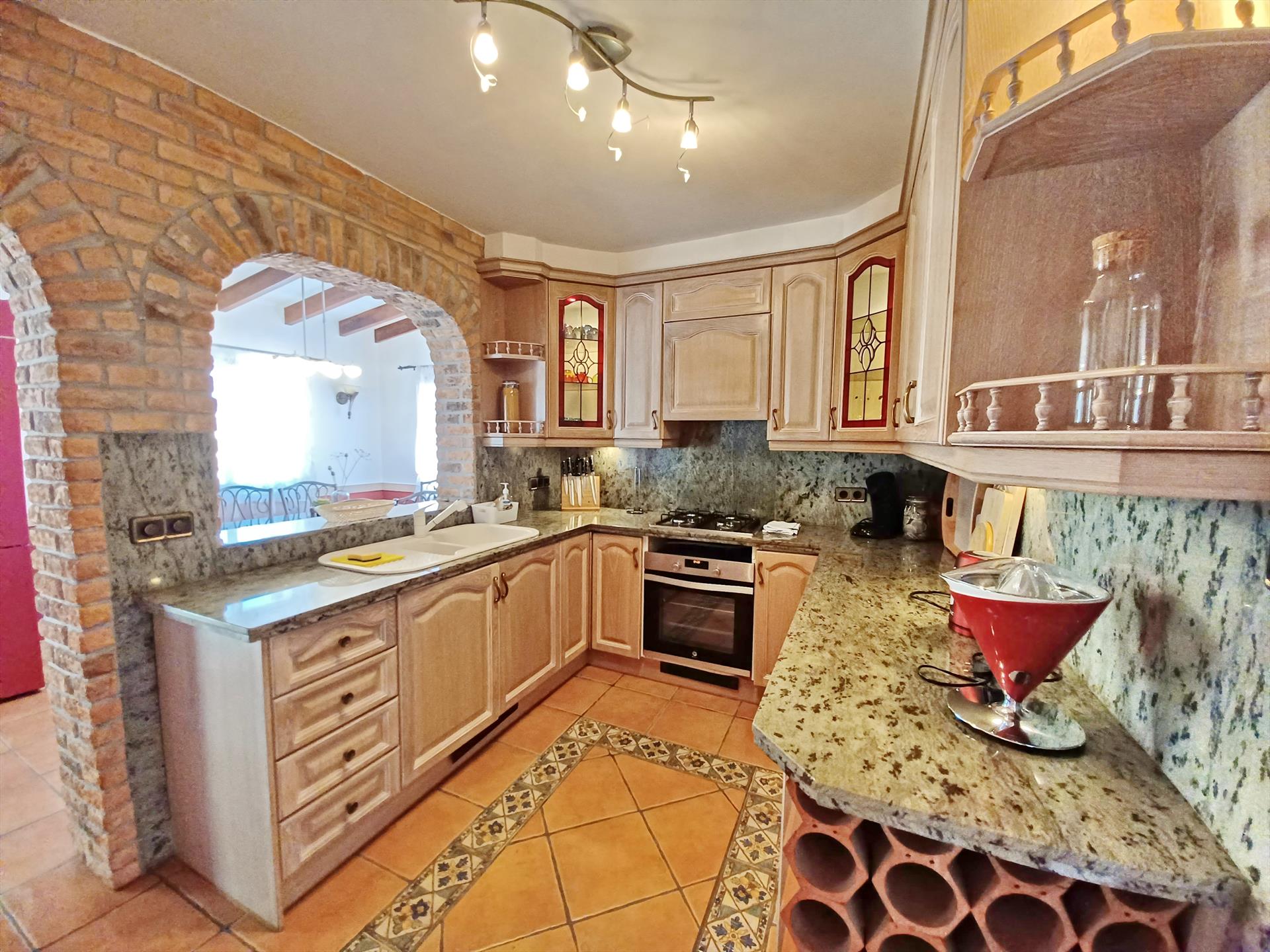 - open kitchen with gas hob, electric oven, microwave, dishwasher, refrigerator-freezer, coffee machine, electric kettle, mixer, toaster and juicer
