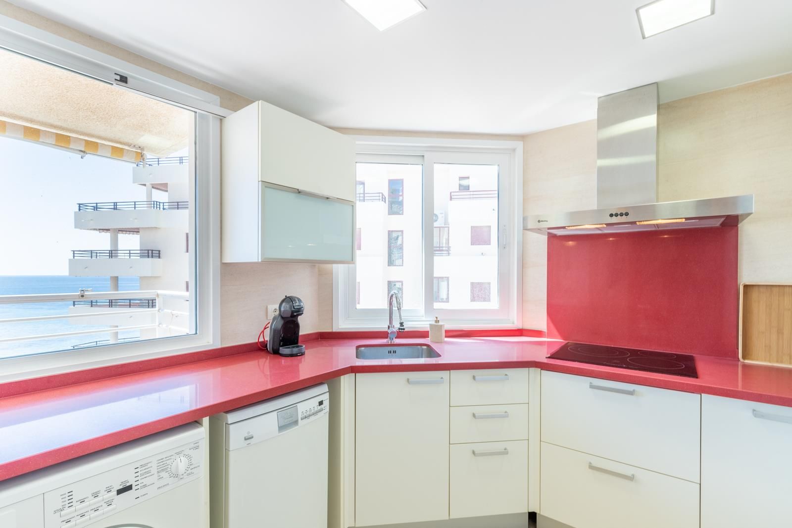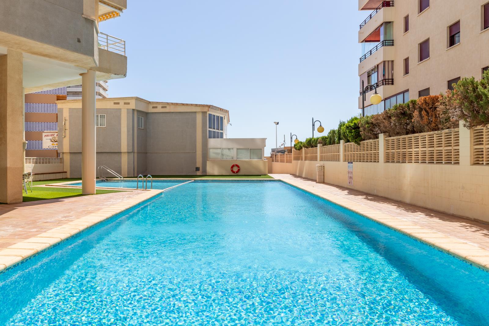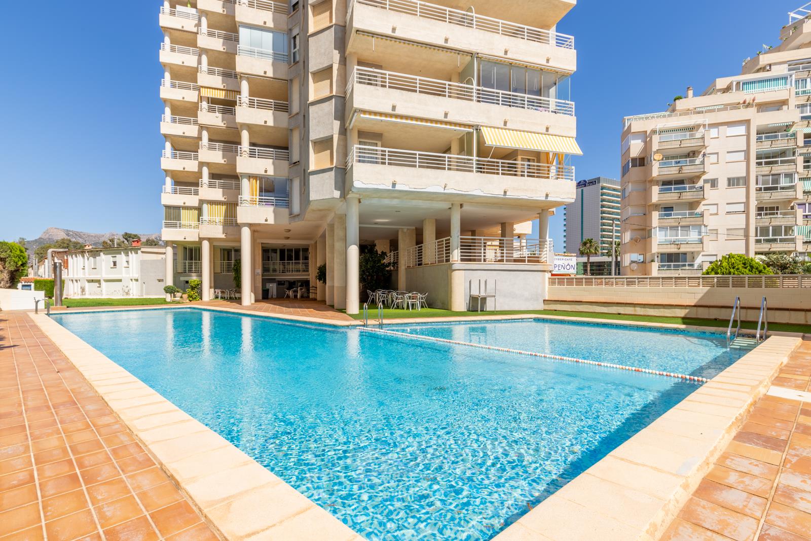 Spacious first-line flat with panoramic sea views and right on the promenade with communal pool in Calpe, Costa Blanca, Spain for 4 people. The property is located in a residential area, close to restaurants and bars, shops and supermarkets directly on the beach of Playa de la Fossa.