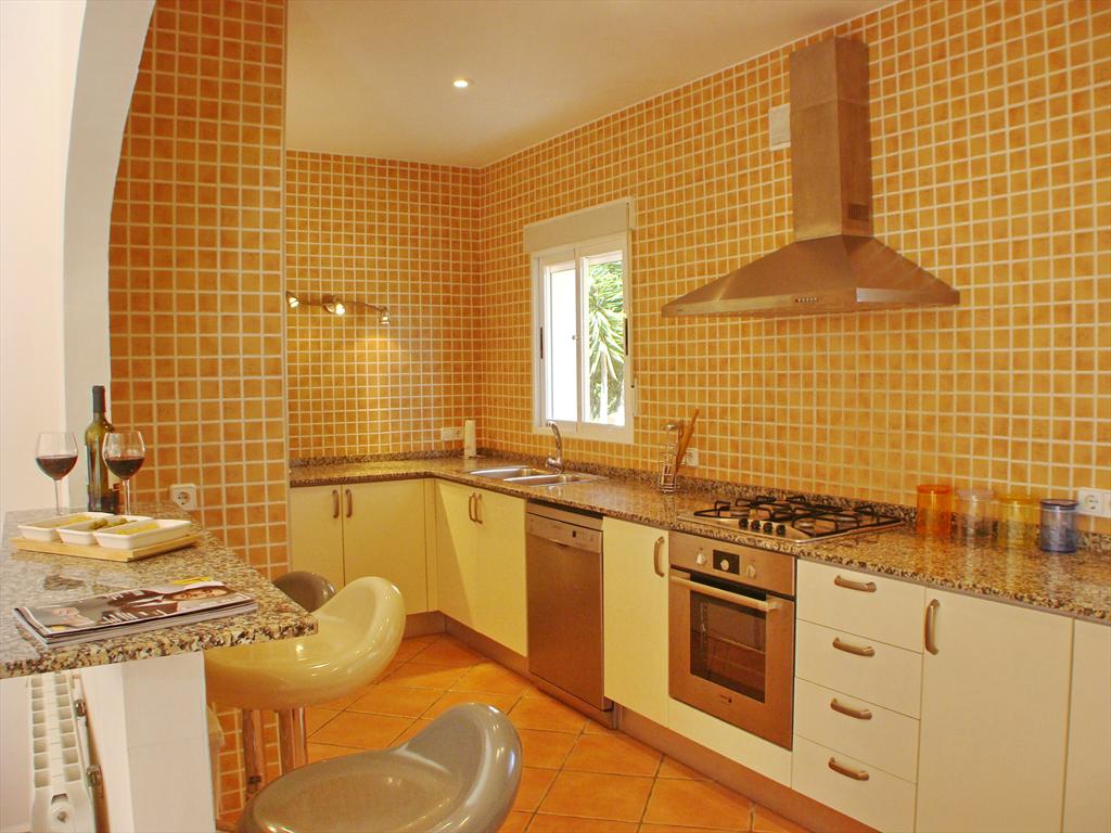 - open kitchen with electric hob, electric oven, microwave, dishwasher, refrigerator-freezer, coffee machine, electric kettle, mixer, toaster and juicer
