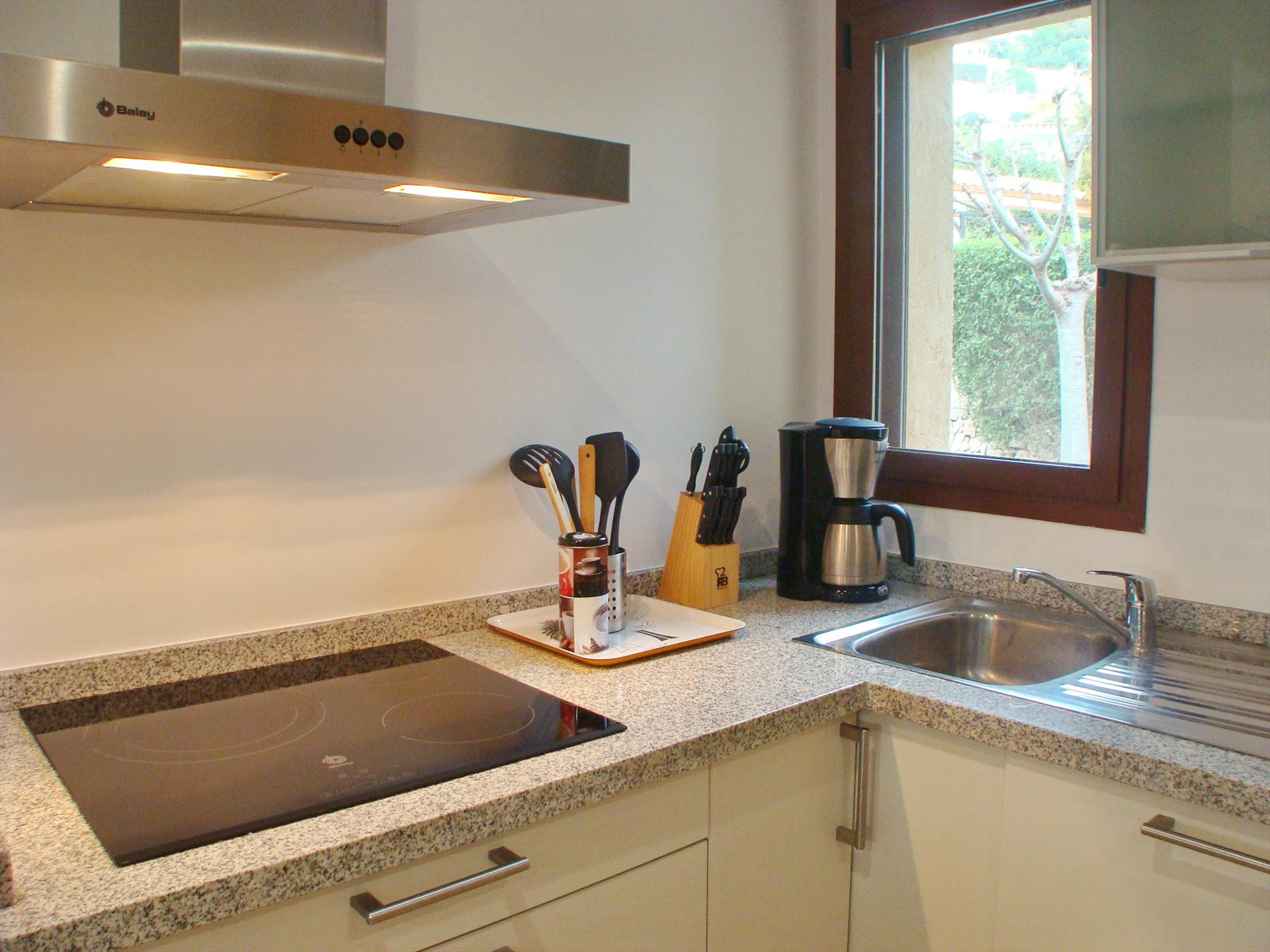 • cuisine américaine avec cuisinière électrique, four électrique, four à micro-ondes, lave-vaisselle, réfrigérateur-congélateur, cafetière électrique, bouilloire, mixeur, grille-pain et presse-citron