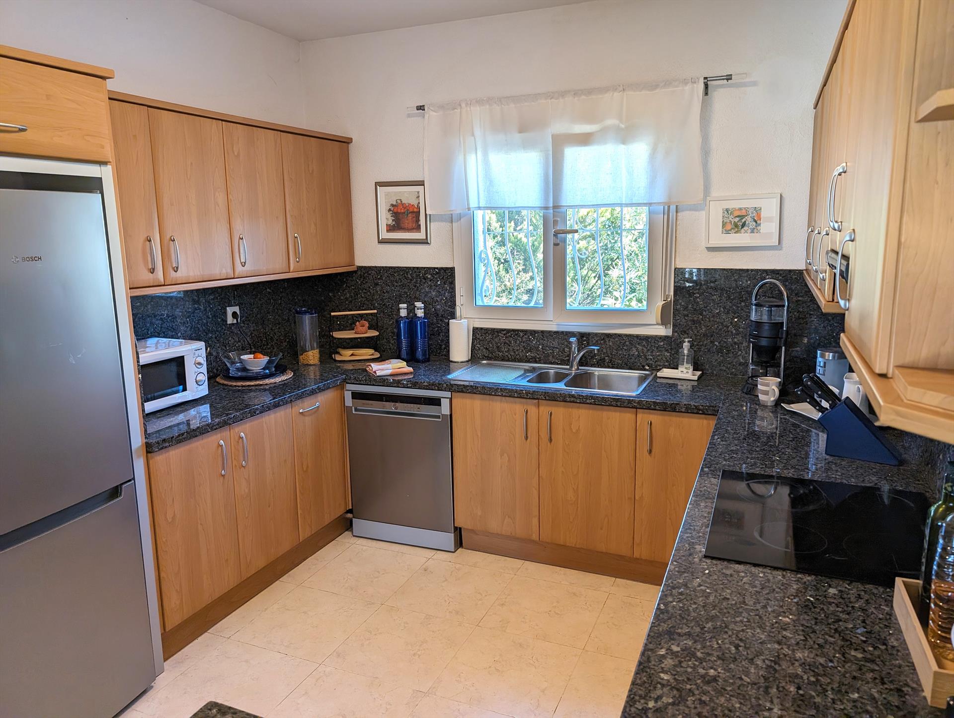 La cuisine ouverte entièrement équipée comprend plaque à induction, four électrique, micro-ondes, lave-vaisselle, réfrigérateur, congélateur, machine à café, mixeur et grille-pain.