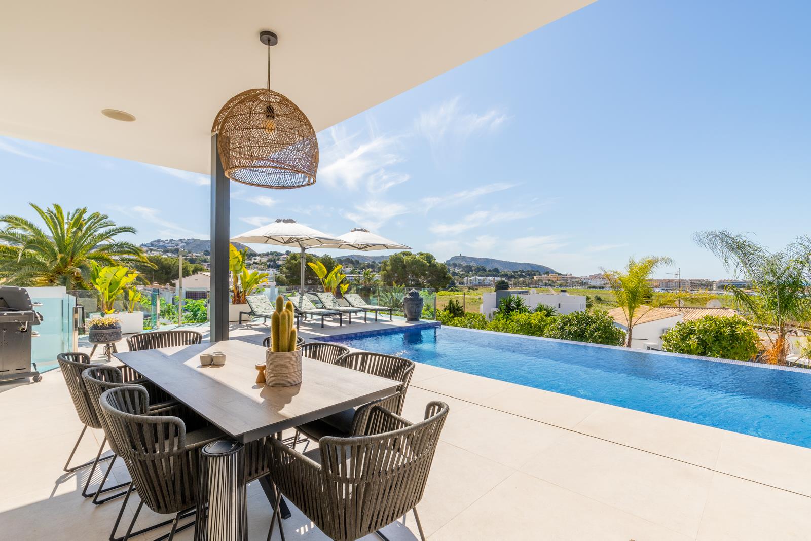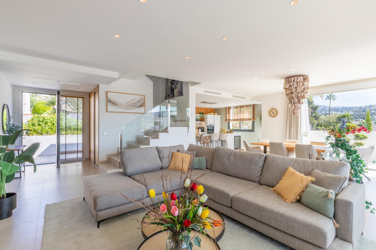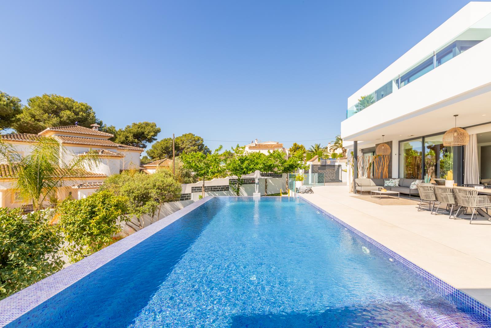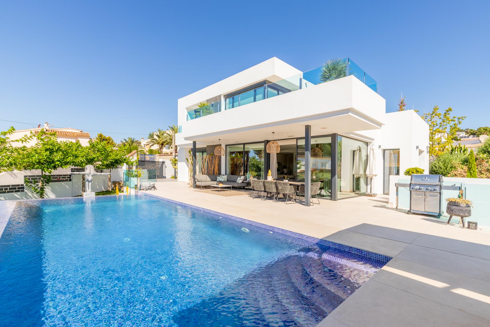Villa moderne et luxueuse avec piscine privée à Moraira, Costa Blanca, Espagne pour 6 personnes. La villa est située dans un quartier résidentiel en bord de mer et se trouve à 1 km de la plage de L'Ampolla.