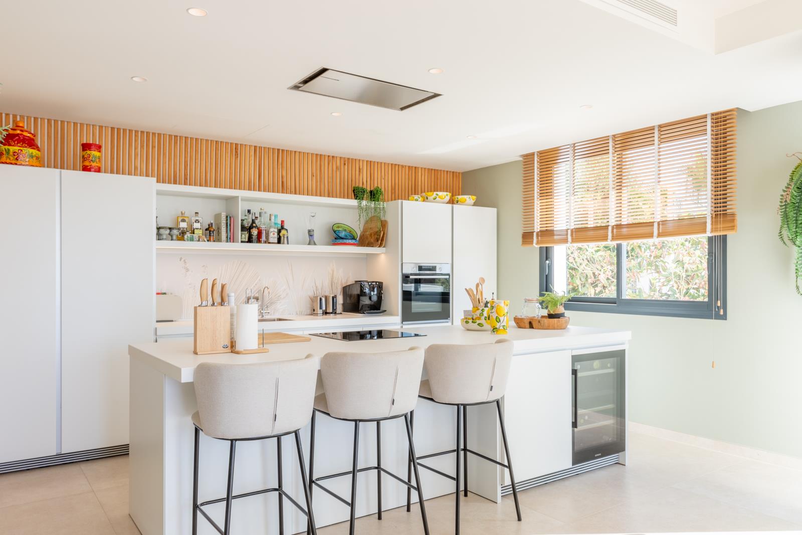 - cuisine ouverte avec plaque à induction, four électrique, micro-ondes, lave-vaisselle, réfrigérateur-congélateur, machine à café, mixeur et grille-pain