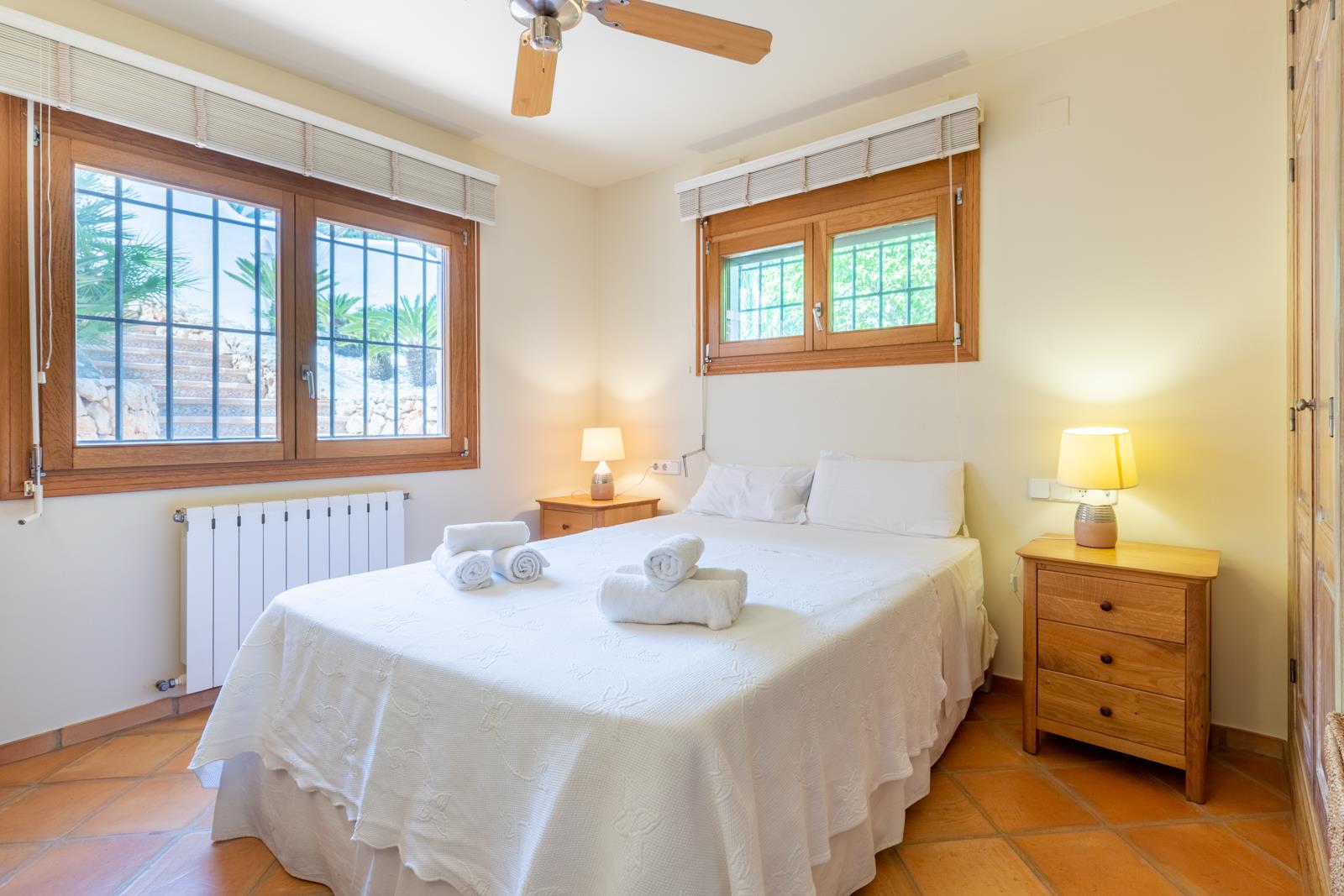 - chambre à coucher climatisée avec lit double et ventilateur