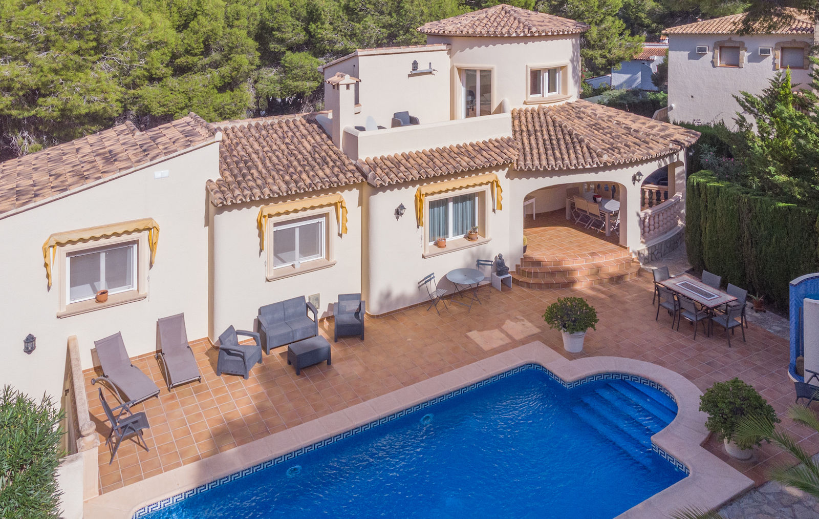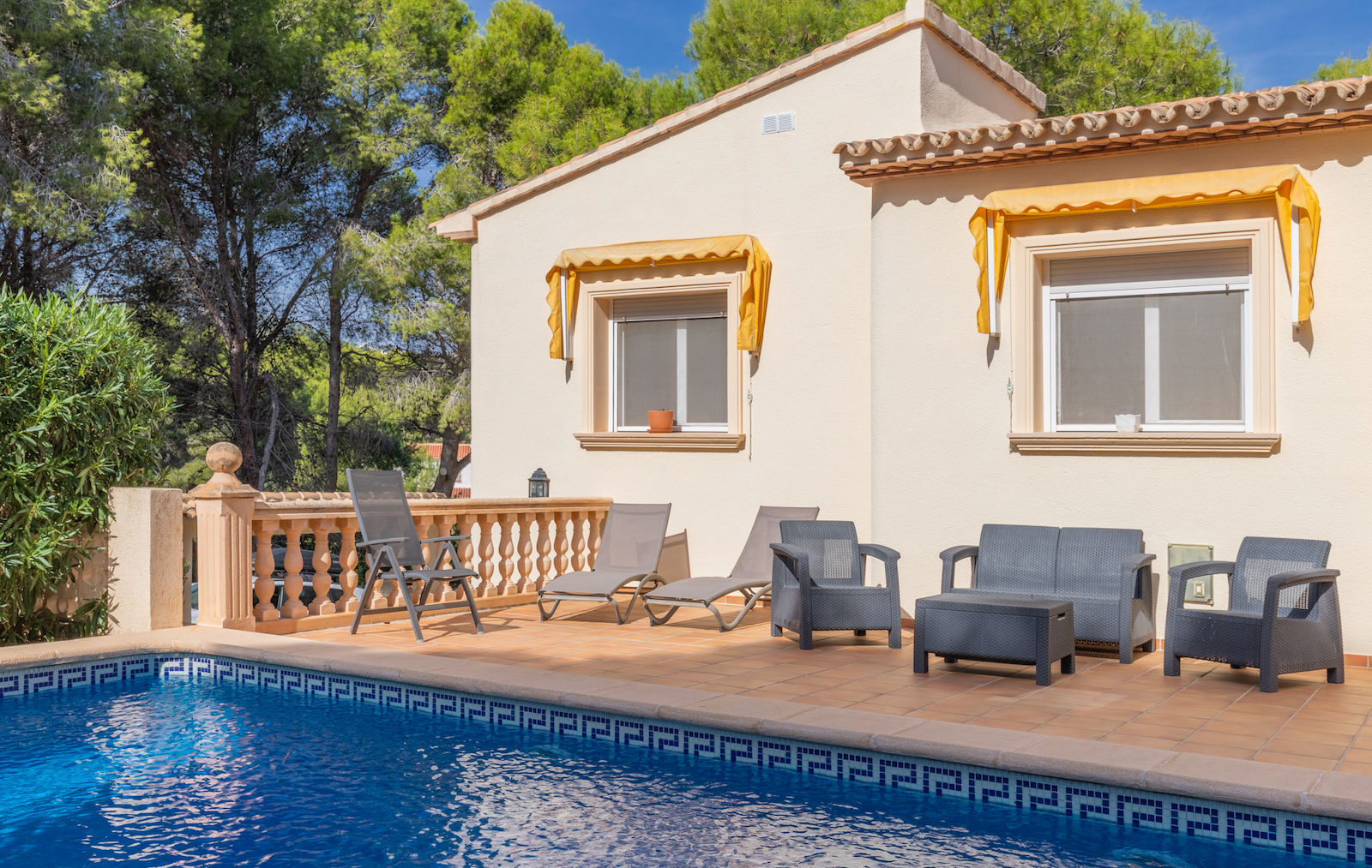 Grote en comfortabele villa in Benissa, Costa Blanca, Spanje met privé zwembad voor 6 personen. De vakantievilla ligt in een residentiële omgeving, dichtbij restaurants en bars en een tennisbaan en op 1 km van het strand van Cala Advocat.