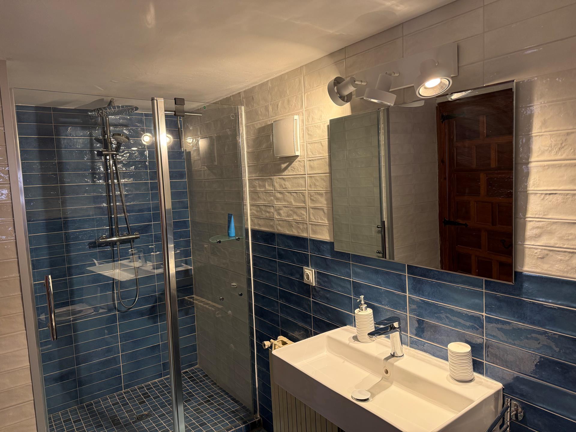 - badkamer met wastafel, douche en toilet