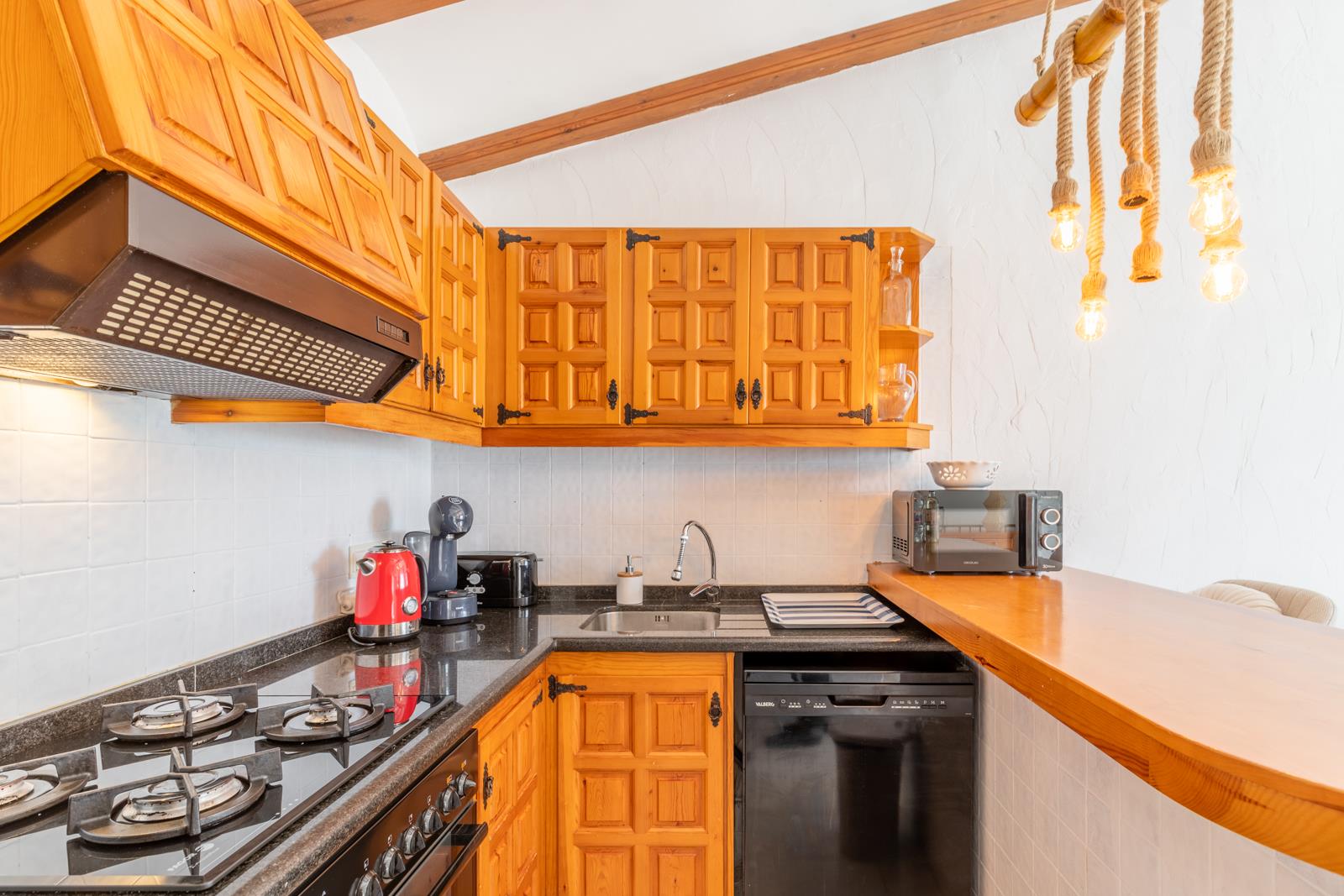 - open keuken met gasfornuis, electrische oven, magnetron, afwasmachine, koel-vriescombinatie, koffiezetapparaat, mixer en broodrooster