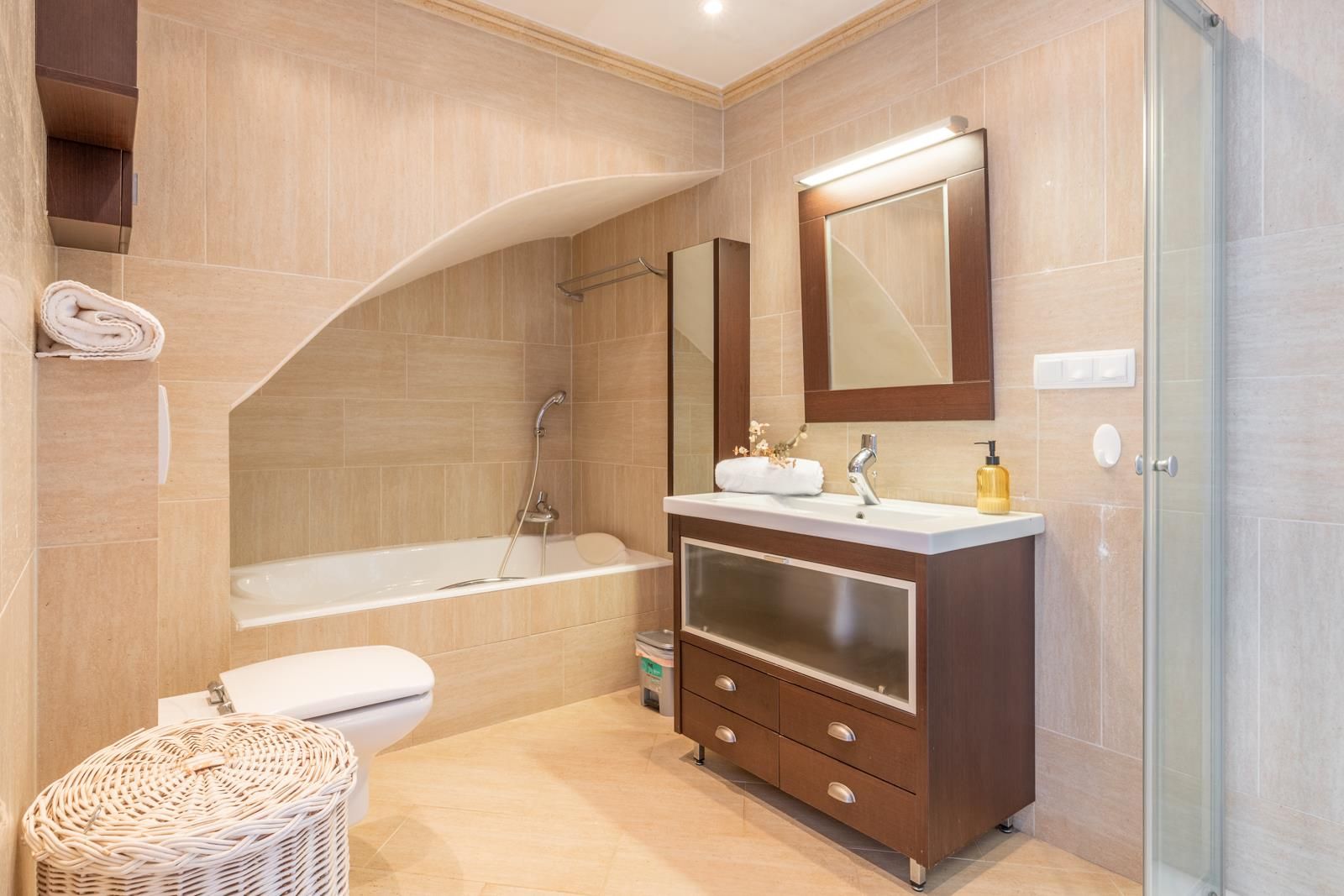 - badkamer met wastafel, bad, douche en toilet